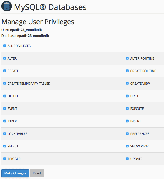 Akan muncul halaman MySQL Databases -> Manage User Privileges