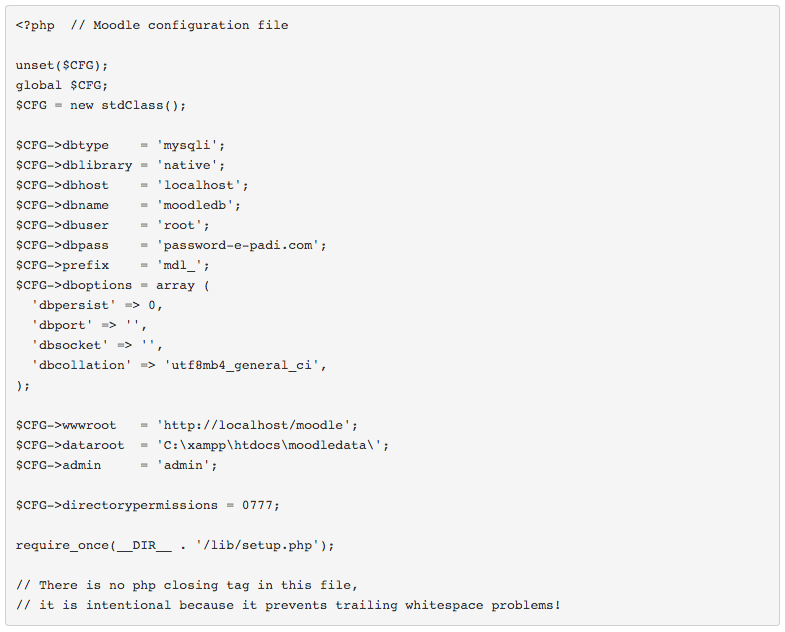 Moodle akan membuat sebuah file config.php dalam directory Moodle, preview file config akan ditampilkan seperti dibawah ini.