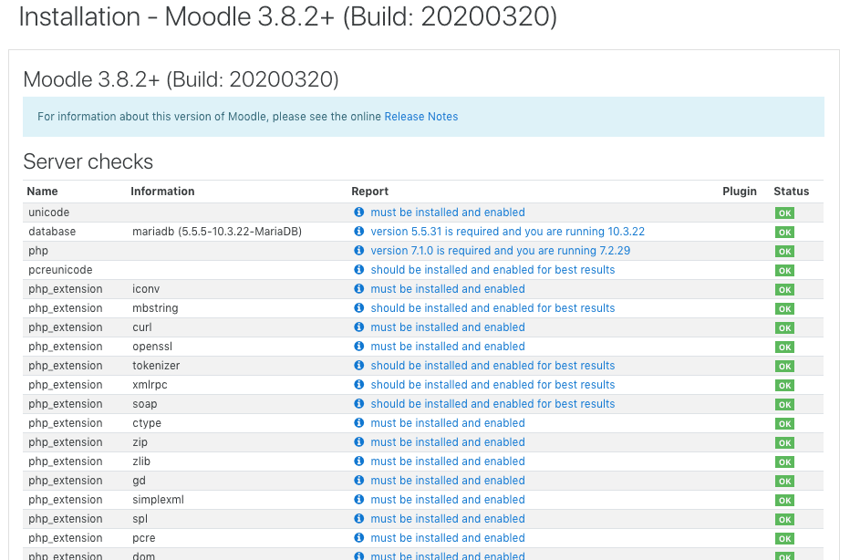 Pastikan semua Status sudah OK, karena semua extensions tersebut diperlukan oleh Moodle, jika ada extension yang masih Check, seperti dibawah ini