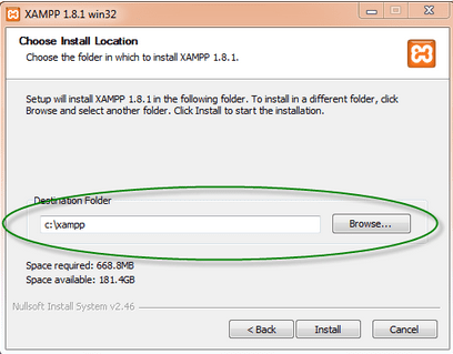 Kemudian Anda akan diminta untuk menentukan lokasi folder penyimpanan file-file dan folder XAMPP. Secara default akan diarahkan ke lokasi c:\xampp. Namun jika Anda ingin menyimpannya di folder lain bisa klik browse dan tentukan secara manual folder yang ingin digunakan. Jika sudah selesai, lanjutkan dan klik tombol Install.