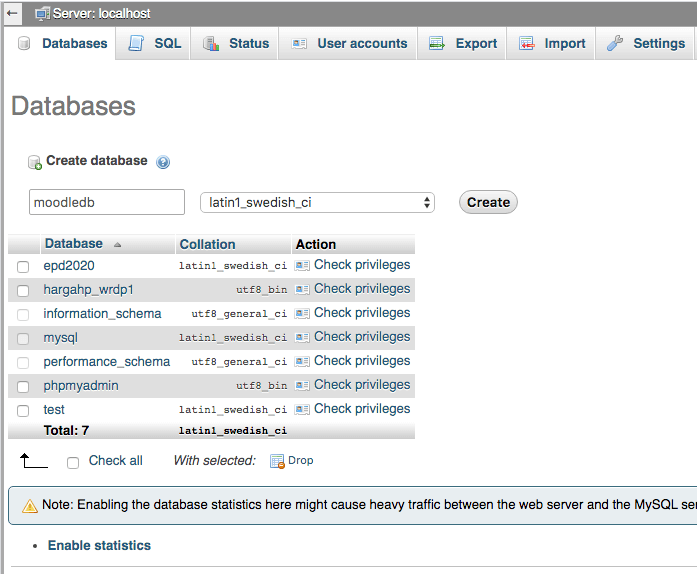 Buka http://localhost/phpmyadmin/, kemudian buat database baru, misalnya “moodledb“
