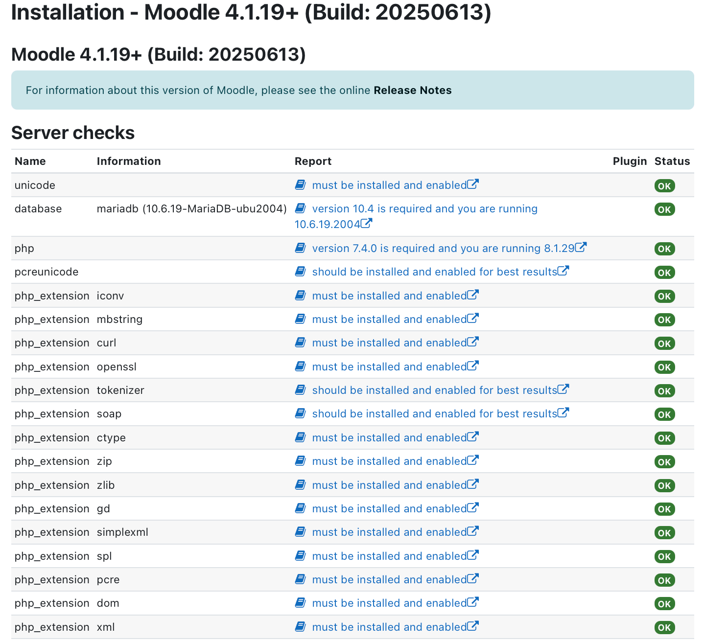 Pastikan semua Status OK, karena semua extensions tersebut diperlukan oleh Moodle, jika ada extension yang masih Check, seperti dibawah ini